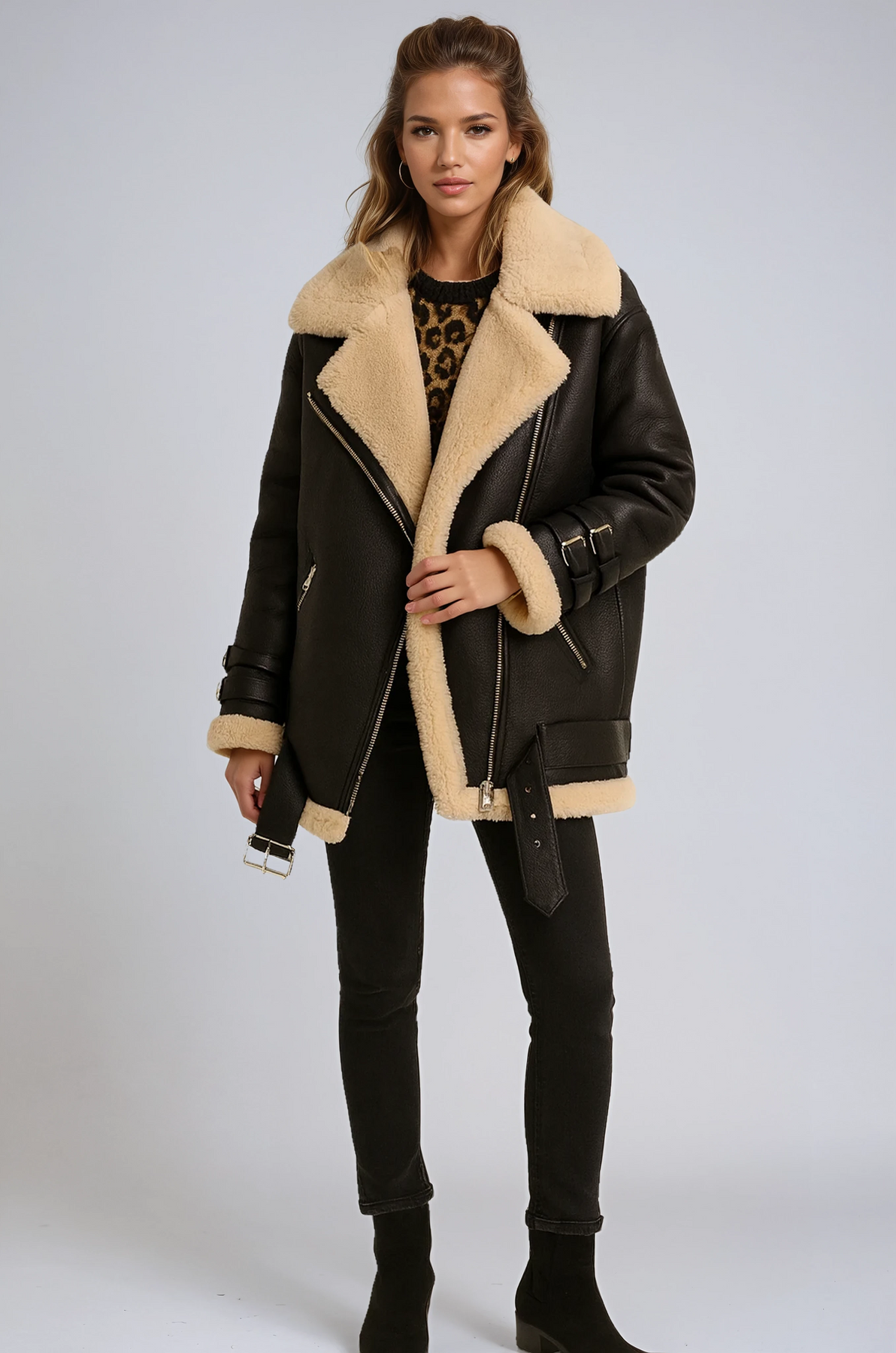 ✔ Luxurious sheepskin lining — envelops you in warmth and softness ✔ Wide collar with fur trim — adds an element of refined elegance ✔ Straps with buckles — a contemporary twist on a classic design ✔ Side zip closure — infuses a rock-chic vibe into your ensemble ✔ Suede finish — exudes understated sophistication